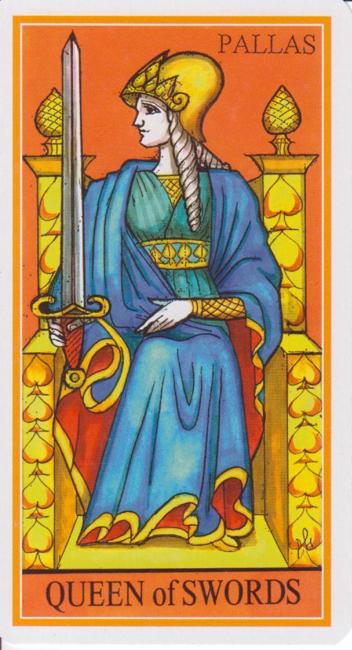 I am optimistic that this sentence alludes to the fact that perhaps my calm intellect will triumph over the stranger’s senseless rage. The Queen of Swords Below is from Paul Huson's Dame Fortune's Wheel Tarot, and depicts the Goddess Pallas. Hopefully in this instance Pallas-Athene is on my side.